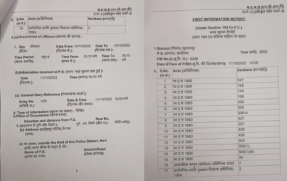 A first information report (FIR) has been registered in the case at the Baldirai police station, Sultanpur, under various sections of the Indian Penal Code (IPC), including rioting, outraging religious feelings, attempt to murder and some sections of the Public Property Act, 1984.