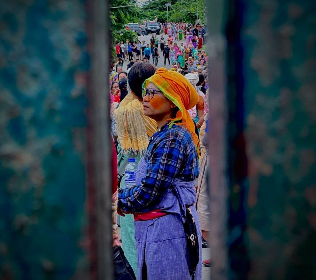 People gathered outside the DC Office, Bishnupur, after women from the Meitei community were injured at the Imphal-Churachandpur border on August 3. Photo: Yaqut Ali