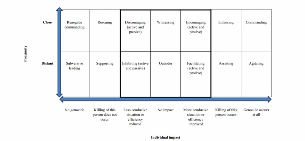 Timothy Williams' typology of action in genocide. Photo: Williams, Timothy. “‘I Am Not, What I Am’: A Typological Approach to Individual (In)Action in the Holocaust.” In Probing the Limits of Categorization: The Bystander in Holocaust History, edited by Christina Morina and Krijn Thijs, 1st ed., 27:72–89. Berghahn Books, 2019.