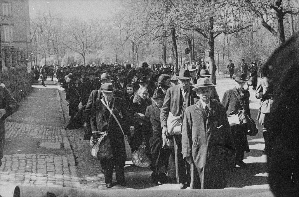 Jewish deportees marching down a street in Germany. Photo: National Archives and Records Administration, College Park, Maryland. Public domain.