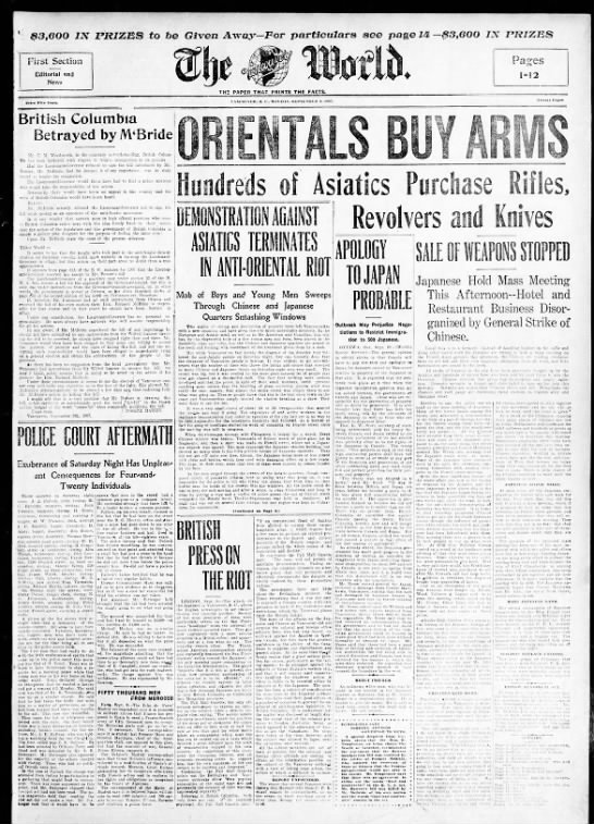 Four days later, September 10, 1907, The World in Vancouver carried a news report, ‘Orientals Buy Arms. Hundreds of Asiatics Purchase Rifles,’ and that sale of weapons was stopped. I must say self- preservation often involves violent means.