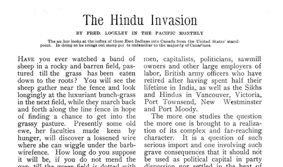 In a May 1907 article for the Pacific Monthly magazine titled ‘The Hindu Invasion; A New Immigration Problem’, Fred Lockley, a leading American journalist, wrote. “Our kinsmen (Indians) in the far East are turning their faces westward. Here and there a tiny crevice has appeared in the dam that has held them in check for so long. They are trickling through in a slight and apparently insignificant stream into the Western lands but will the stream gradually enlarge till it floods our lands and menaces our institutions?”