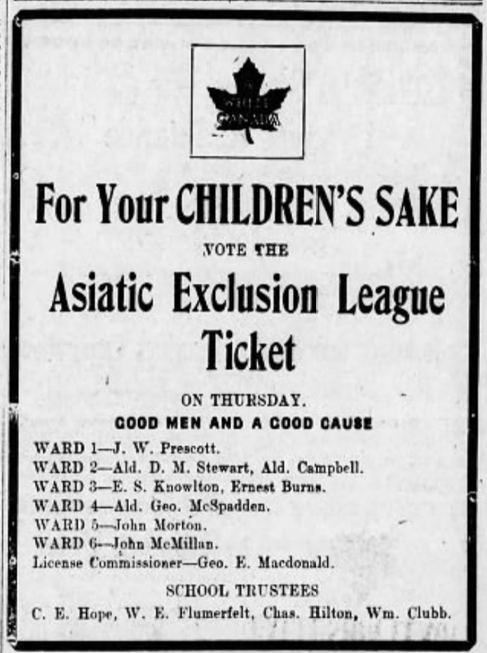 But to proceed, the first public meeting of the AEL was held on August 12, 1907, where the MP of Vancouver warned of “an invasion of Asiatics who are swarming into our country every month” and ‘the inevitable result of this great influx of the yellow race will be the retreat of the white race already here”.
