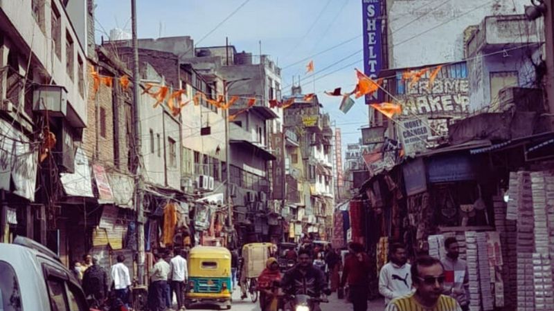 Saffron flags in a marketplace. Photo: Nalin Verma.