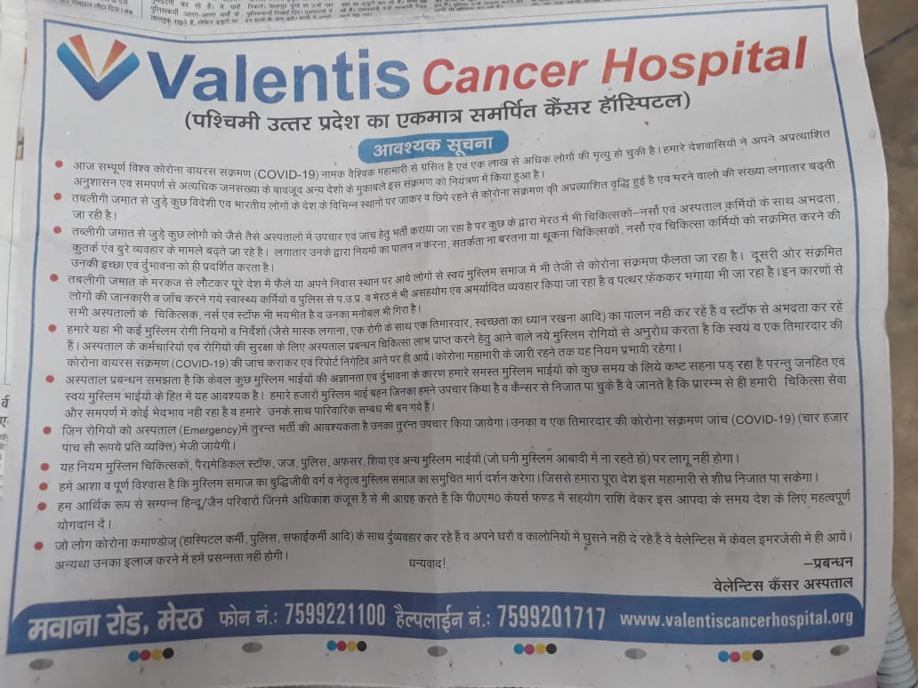 “Several Muslim patients are not following the guidelines (like using a mask, maintaining hygiene) and they are also misbehaving with hospital staff. For the security of hospital’s staff and patients, the hospital administration requests all new Muslim patients that they and one designated caretaker get tested for COVID-19 and visit the hospital only if their reports are negative,” a part of the advertisement issued by the Valentis cancer hospital in the Meerut edition of the Hindi daily on Friday read.