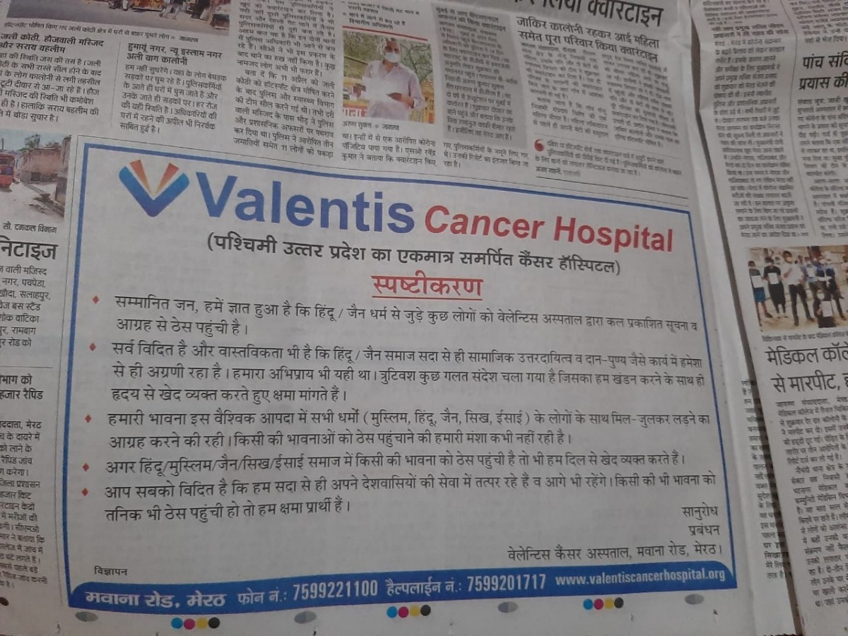 Clarification published by the Valentis Cancer Hospital in the Dainik Jagran (Meerut edition) on Saturday, April 18, 2020.