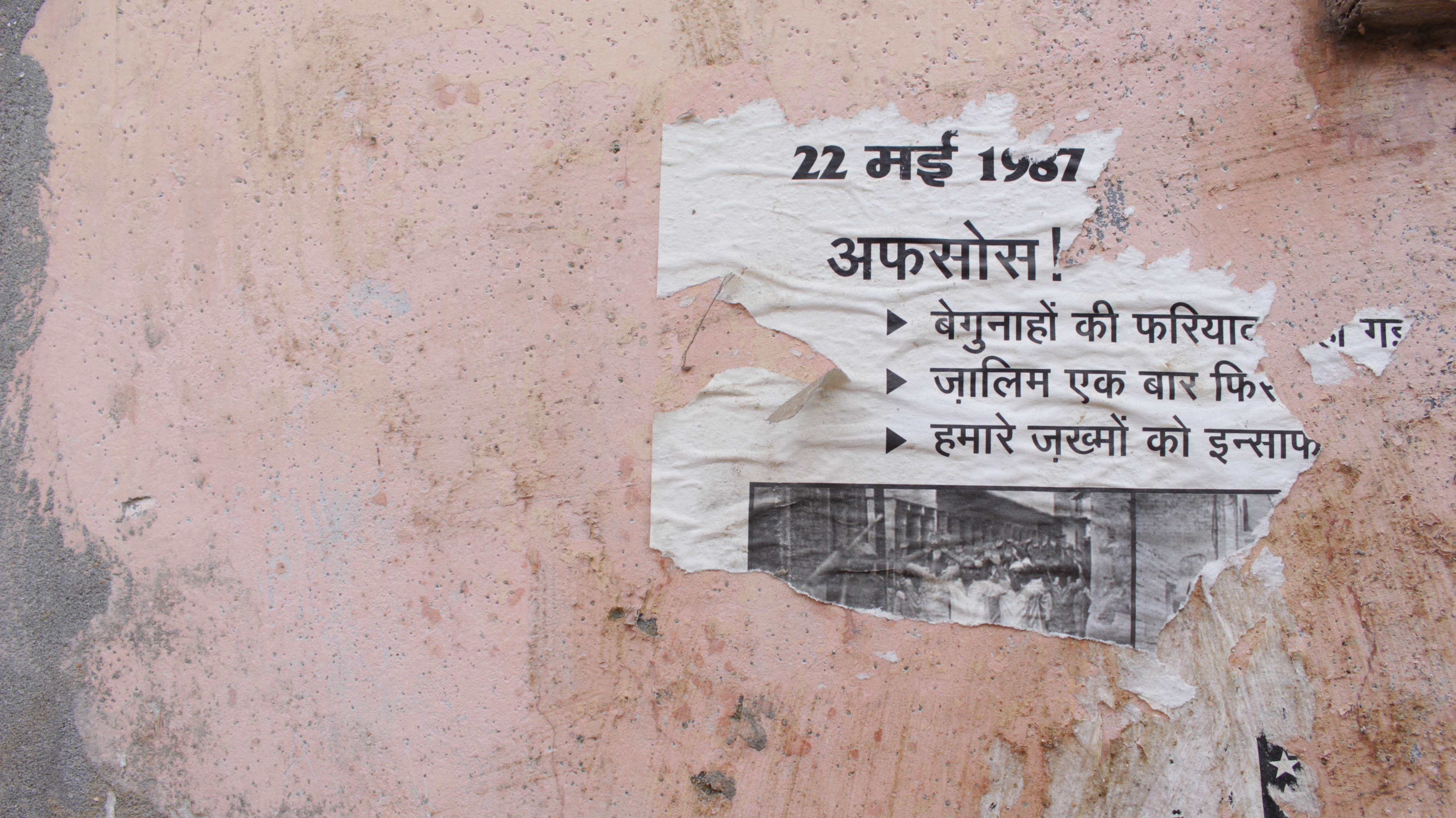 A half-torn poster on the wall of a house in Hahsimpura; registering disagreement with the court judgment and calling for justice. Credit: Salik Ahmad