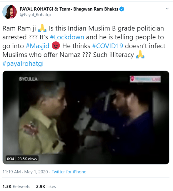 A video of former AIMIM MLA Waris Pathan was shared by BJP MP Arjun Singh with the claim that Pathan was threatening Mumbai police during the lockdown. In the video, Pathan can be heard telling a cop to not disrupt people from offering namaz. “These people have been praying here for the last 40 years. Do not try shutting down the mosque, do not try to shut down the loudspeakers,” he says.