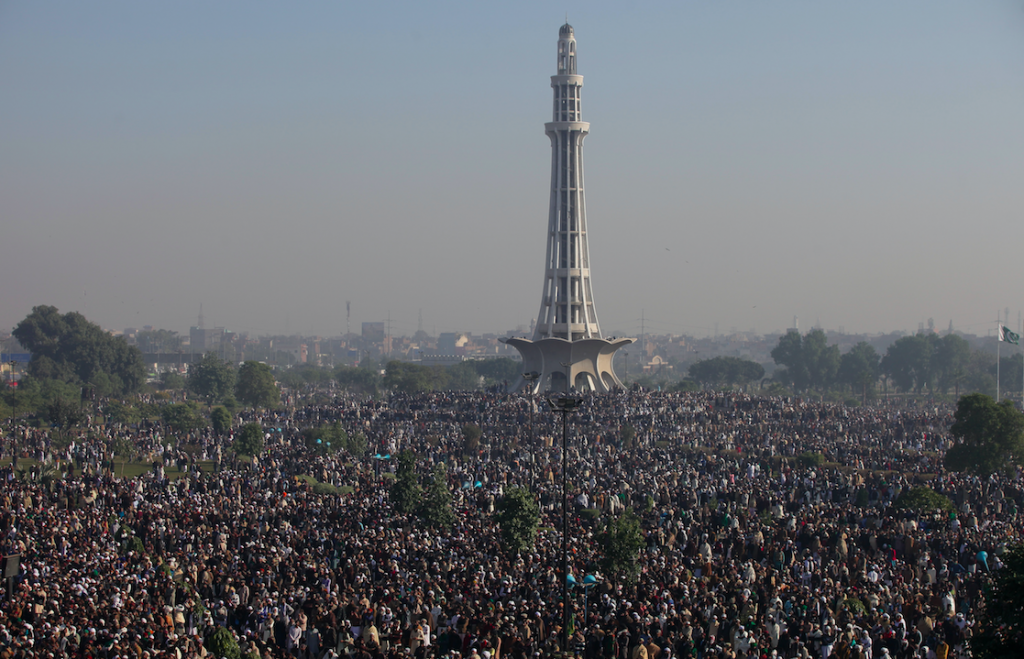 People gather to attend funeral services for Khadim Hussain Rizvi, leader of religious and political party Tehreek-e-Labaik Pakistan (TLP), at the Minar-e-Pakistan monument as the outbreak of the coronavirus disease (COVID-19) continues, in Lahore, Pakistan November 21, 2020. Photo: Reuters/Mohsin Raza