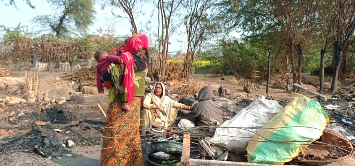 Women sift through ashes to find any of their valuables after fire broke out at Rohingya refugee camp in Haryana's Nuh.