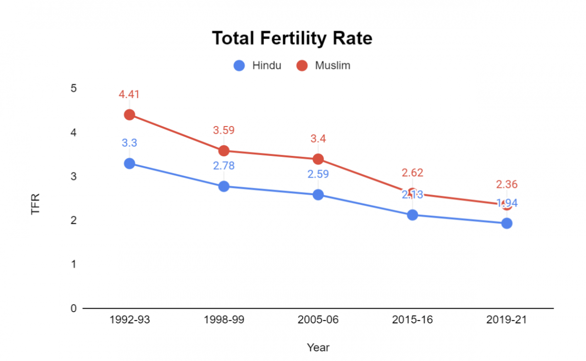 Total Fertility Rate (TFR), defined as the average number of children born to a woman during her lifetime, is the most widely used statistic to determine the birth rate dynamics of a community. According to data from the National Family Health Survey (NFHS), while Muslims do have a slightly higher TFR, the difference between Hindus and Muslims has been shrinking rapidly. Experts predict that soon the TFR for both the communities will converge and stabilise. Multiple studies have shown that factors like education, healthcare and income levels directly affect the TFR of a community.