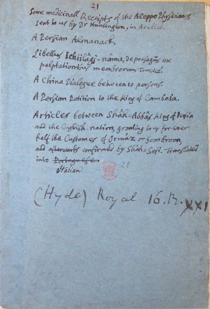 The contents of Royal MS 16 B, indicating the fifth item as "A Persian Petition to the King of Cambaia". (Royal MS 16.B.XXI)/ Public domain