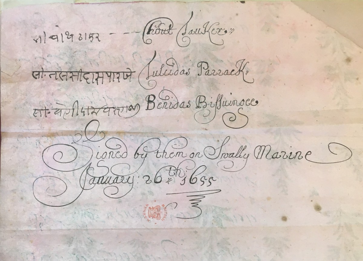 On the reverse, we find three Gujarati signatures with their rough English equivalents: