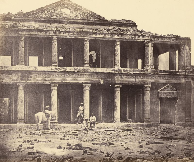 A group of Indian men stand against a palace in ruins, the ground in front of them strewn with skeletal remains. This photograph appears to capture the immediate aftermath of the violent conflict at Secundrabagh, Lucknow — one of the events that marked the unsuccessful 1857 Rebellion against British rule in India. In fact, the photograph was taken months after the capture of Lucknow. The image had been carefully staged: the interred remains of Indian rebels had been exhumed and arranged in a reconstruction of reality designed to heighten the dramatic impact of British victory.
