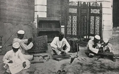 William Hoey, a License Tax Officer in 1879-80, writing about Lucknow carpenters (barahis in Hindi and najjārs in Persian) remarked on the variation between wages of a high skilled building carpenter (6-8 annas a day; 16 annas = 1 Rs.) and an ordinary carpenter (3-4 annas a day). A typical master-carpenter owning a workshop hired several journeymen and apprentices. In 1906, S.H. Fremantle, a labour inquiry officer, commented that the Lucknow railway workshop could not find skilled carpenters locally and imported 400 carpenters from Punjab at an average wage of 14 annas per day (8 annas for local carpenters). Conversely, the aligned trade of wood carving faced a major decline. Facing the loss of state patronage, as well as new English trained Indian elites’ preference for a colonial style of inornate furniture, wood-carvers struggled to sustain their trade. The British commissioned wood carvers only when they had to show the glory and the extent of their empire in local and international art exhibitions.