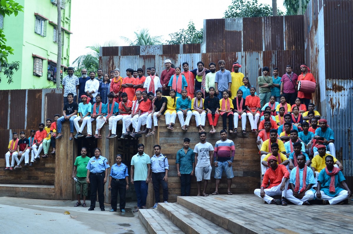 Probably for the first time in the history of Durga Pujo, a pandal has been built to serve as a platform for live theatre. Where more than 80 artists are performing a short drama, with light, sound, props in batches from six in the evening till the dawn breaks.