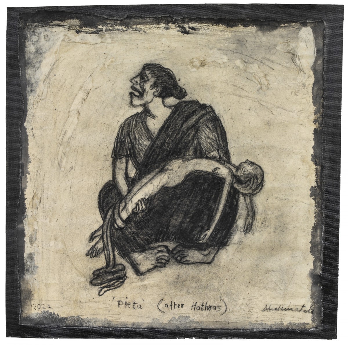 For instance, Madangopal Singh’s poem ‘Baaddra’ (trans. O Border) is a spatial evocation of the Singhu and Tikri borders and farmlands, framing the farmers’ protest as a localised dissent turned into a national movement; Shakuntala Kulkarni uses charcoal in her work ‘‘Pieta’ (after Hathras)’ to fashion a grim picture of the gangrape and murder of a 19-year-old Dalit girl in 2020. In doing so, she transforms the solemn contemplation of Michelangelo’s Mary into an inconsolable cry of the victim’s mother.