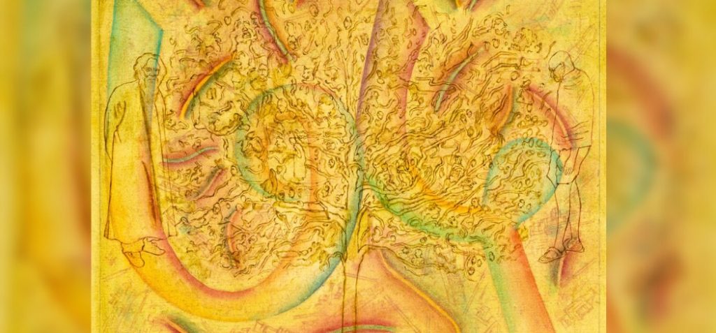 Artist Gulammohammed Sheikh's work uses broad calligraphic strokes to script the number 75 in Devanagari, superimposing upon it delicate sketches of Rabindranath Tagore and Mahatma Gandhi, as scores of human and animal figures branch out seamlessly between the two figures. Photo: By arrangement