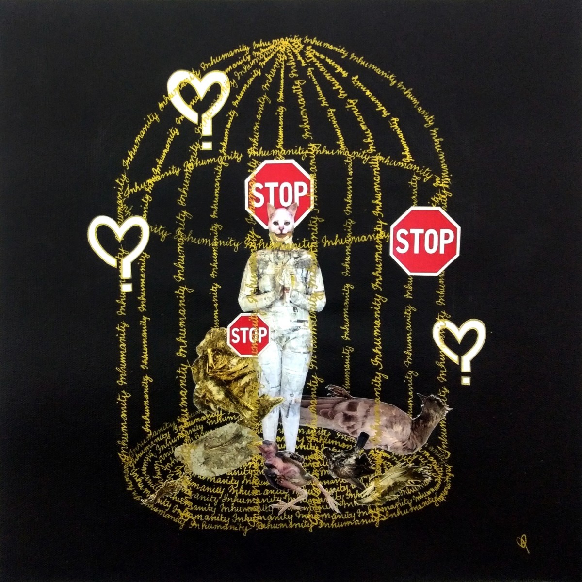 Parul Jain’s digital artwork indicts the Man as well as the media through an allegorical framing of cat-in-a-bird-cage. Photo: By arrangement