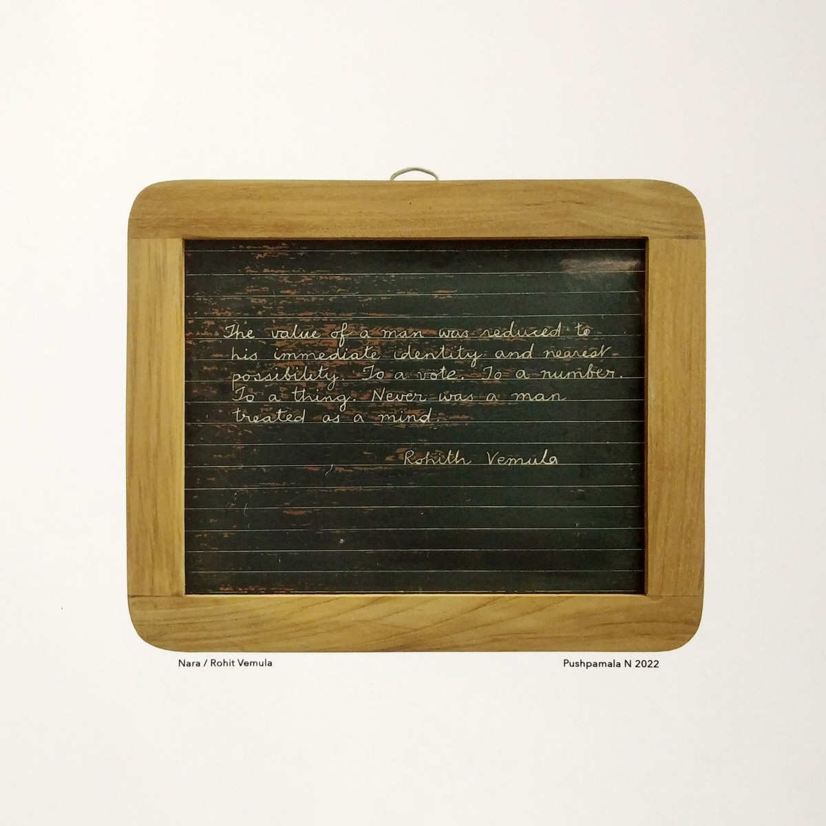 In his powerful poem ‘Kinme ho tum?’ (trans. Among which are you?), Vishnu Nagar examines the dialectics of silence and speech that haunts present-day India, while Pushpamala. N cites lines from Rohit Vemula’s suicide letter, offering a scathing critique of what remains of the “value of a man”. Framing it on a black slate, the artist endorses its potential in the political discourse in India.