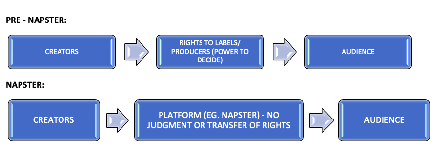 A platonic shift in the internet music space came by virtue of Napster, a peer to peer sharing service aimed at increasing access at an exponential rate, at the cost of IP norms. It eradicated the need for creators to give up rights in favour of anyone, merely to put their music out there. Although Napster faced copious litigation and an untimely demise, but what it did do was open up a world of possibilities; possibilities of alternate conceptions of how we distribute content and also how we protect those who create.