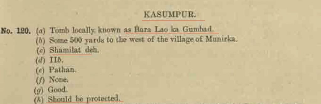 During the colonial era, Bara Lao ka Gumbad was located in what was the Palam tehsil of Delhi. South of Shah Jehanabad, Delhi was primarily divided into villages. The area behind the Priya complex (bordering Munirka village) was Kusumpur village, and it was here that you would have found the gumbad.