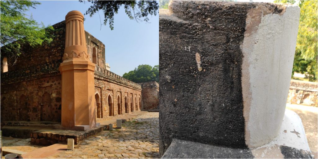 Left: One edge has been renovated and the rest has been left in its earlier conserved state. Right: The front part has been repainted but the back has not been. Photo: Ragini Jha
