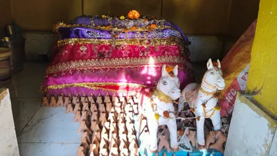 Behind them is a raised surface, which Jana refers to as an astana – this is where Muslim devotees spread their chador and offer shirni as prayer. Hindus offer twin clay horses, incense, and flower garlands. The religions hum in perfect harmony, under the revered eyes of the cow god.