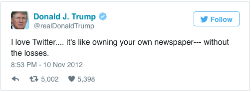 Trump is the first US president to use his personal Twitter account @realDonaldTrump. Since his account was created in 2009, Trump has sent out 34,800 tweets. One of the most active politicians on Twitter, Trump has previously expressed his love for Twitter.
