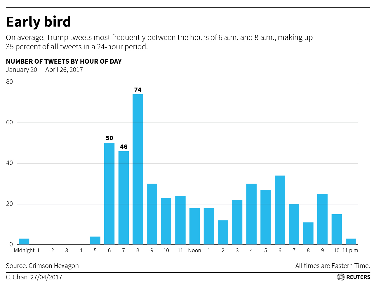 Nearly 100 days into his presidency, Trump has posted 489 tweets, or about five per day on average, typically between the hours of 6 a.m. to 8 a.m. EDT, according to data compiled by Thomson Reuters.