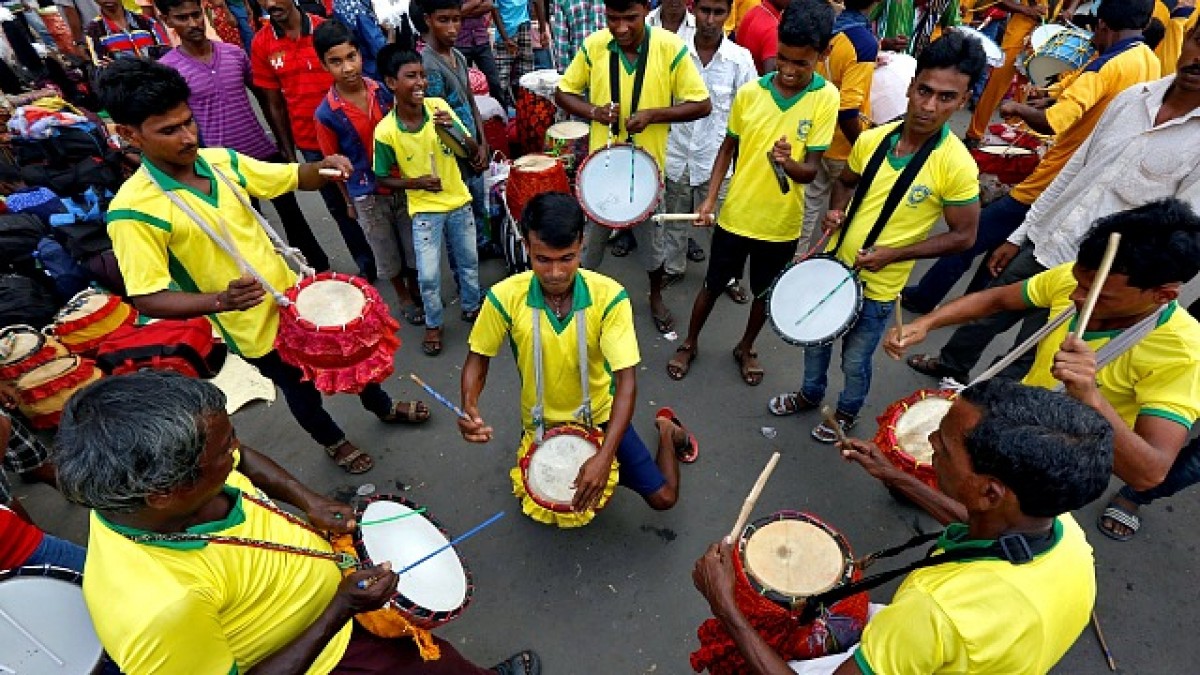 Men beat traditional drums to attract organisers to hire them to perform at pandals of the Durga Puja in Kolkata. Photo: Reuters/File