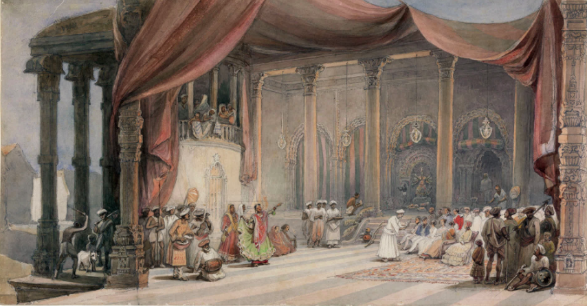 William Prinsep's painting showing Europeans being entertained by dancers and musicians in a splendid Indian house in Calcutta during Durga Puja. This is assumed to depict a scene between 1830 and 1840. Photo: Public domain