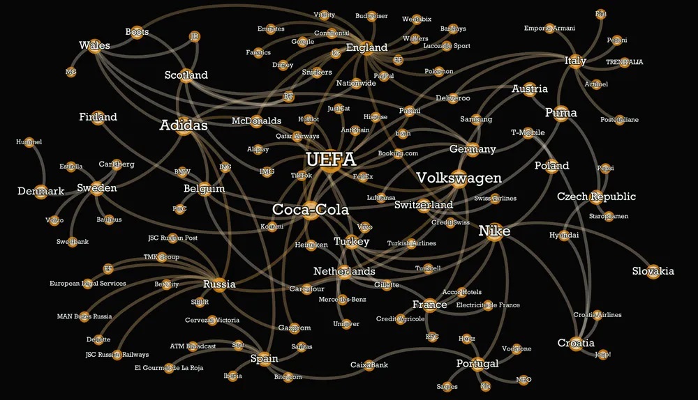 The list goes on (and on). To capture the complex network of sponsors at Euro 2020 we created a network graphic of some of the most prominent and significant deals on show over the coming weeks. For reasons of clarity, we weren't able to include every sponsor, but the range on display is revealing.