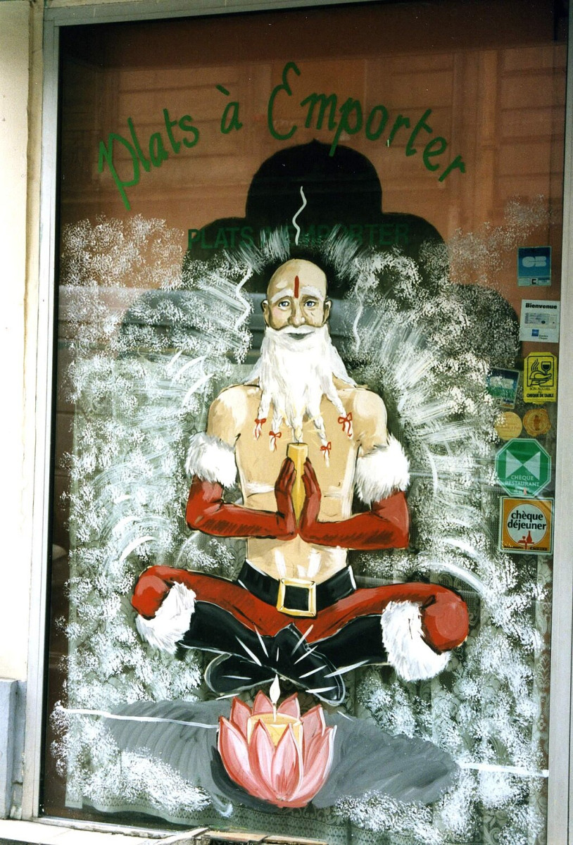 A photo of Santa Claus in Hindu prayer position painted on the storefront of an Indian restaurant in Paris on the occassion of fêtes de Noël, celebrated in France. Photo: Isabelle Rigoni, Public domain, via Wikimedia Commons