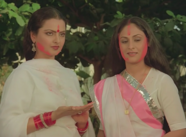 The song ‘Holi ke din dil khil jaate hain’ in Sholay, 1975 shows the village celebrating, the dance led by the appropriately named Basanti (Hema Malini), just before the dacoits attack. While Veeru (Dharmendra) and Basanti dance, Jai (Amitabh) watches Radha (Jaya Bachchan) who keeps her distance from the celebrations as her widow status meaning she does not play Holi.
