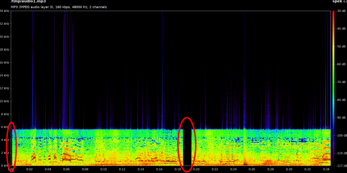 The same lack of volume can be seen when the audio is analysed using Spek which is an acoustic spectrum analyzer software. The image generated by Spek can be seen below. The two distinct spots with zero audio level is even more apparently in the waveform generated by Spek.