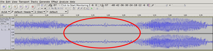 We analysed the three videos using an audio editing software called Audacity. What is observed consistently across all the three videos is that in two spots in the video, the volume or the audio level is ZERO (circled).