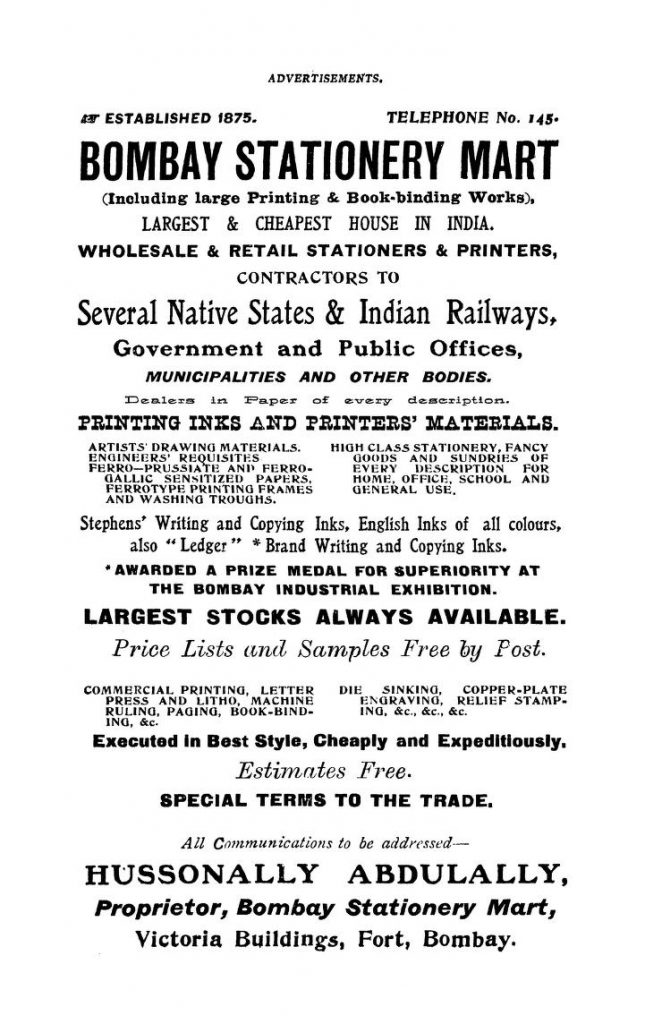 "This printing press was established by Mr. Hussonally Abdoolally in the year 1900 in premises near the Elphinstone Circle, opposite the well-known Bombay Stationery Mart, of which he is also the Proprietor, and its inception was due to the fact that he found his stationery contracts included printed forms and books, and that as a consequence a printing department had become indispensable. From small beginnings the business increased from year to year, and in the early part of 1905, it was decided to take over an adjoining building and fit it with new machinery and the latest styles of British and American types, and in the same year, a thoroughly trained English printer was appointed to superintend the practical working of the press."