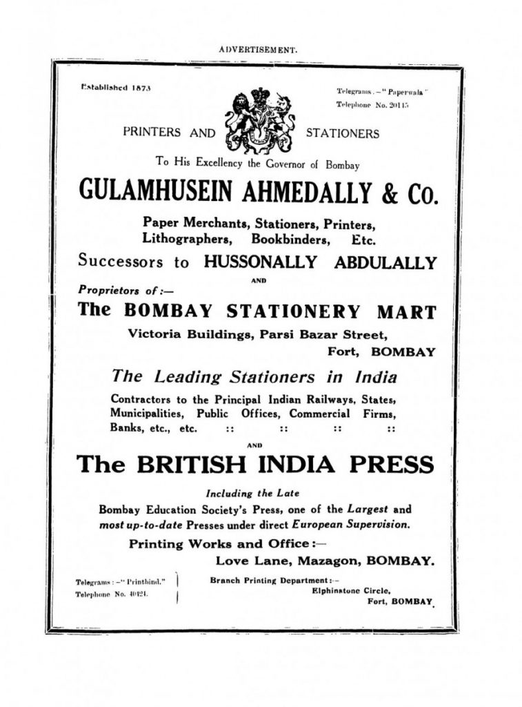 As he did not have any sons who survived into adulthood, Hussonally Abdoolally was assisted in his sprawling business by his two sons-in-law, Ahmedally Mulla Khanally and Ahmedally Abedin Madraswalla. His grandson and heir, Gulam Husein Ahmedally, also joined the business at an early age. By 1917, when Somerset Playne (or his Bombay representative) visited the British India Press at Mazagon, its facilities were world-class: