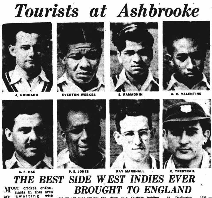 Of his batting under tremendous pressure Hadley writes, "[It] is Weekes who I am making the champion of them all. He came in at 12.30 with the score 80 for four. Exactly half an hour later he had 30 runs against his number on the scoreboard’ and goes on to describe the team reaching hundred: the “two successive fours with which he put up 100, the first a superb cover drive and the second a leg glide. And two more successive fours in another over a few minutes later.”