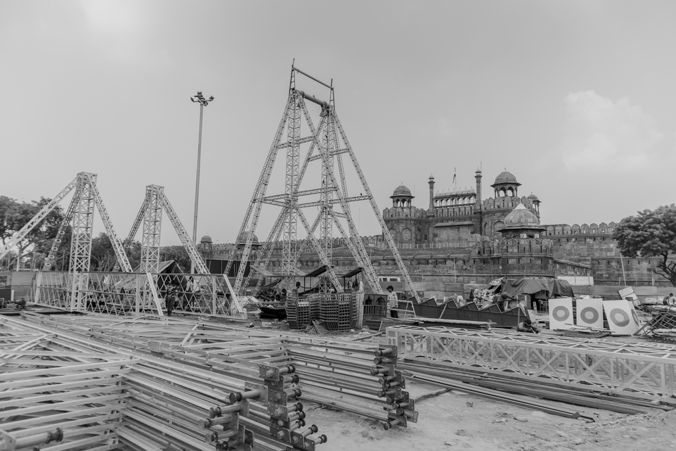 Preparations for the grand Dussehra mela at Lal Qila, Delhi, are underway, as workers transform the grounds into a space for celebration.