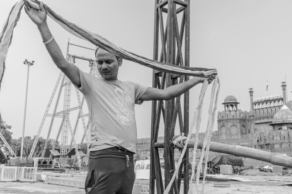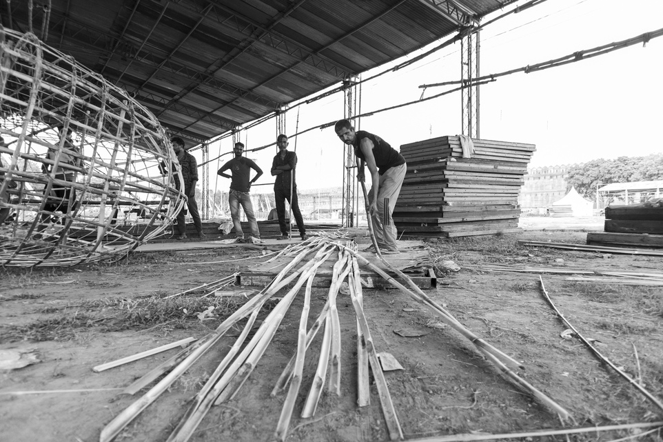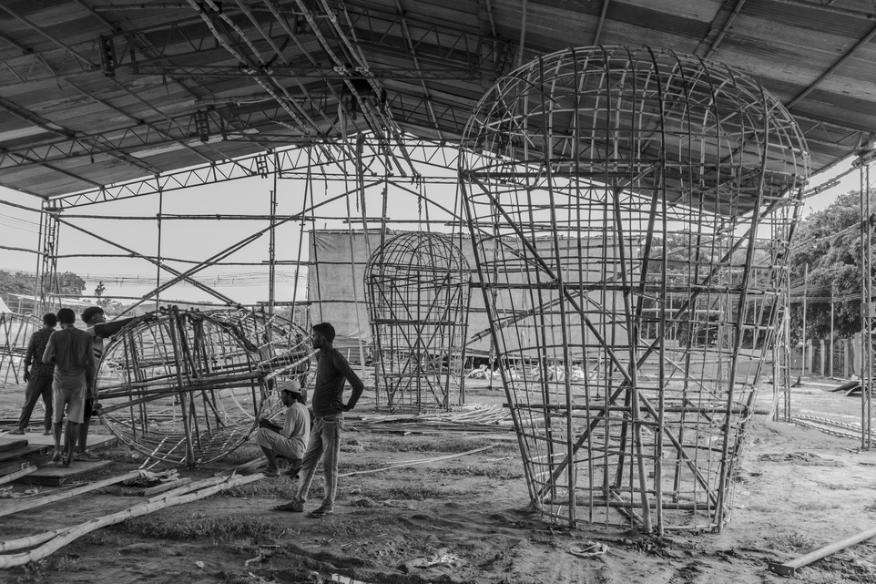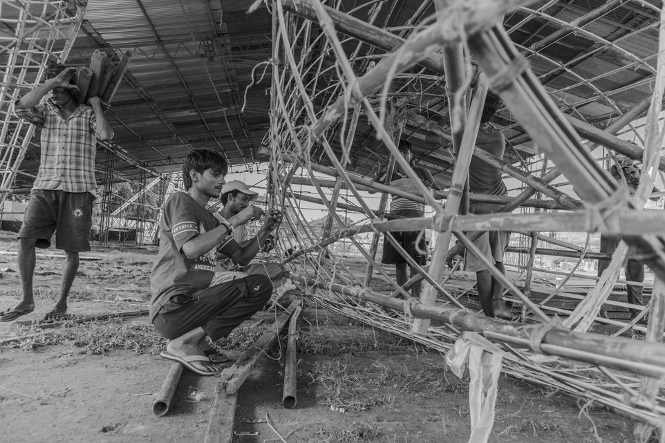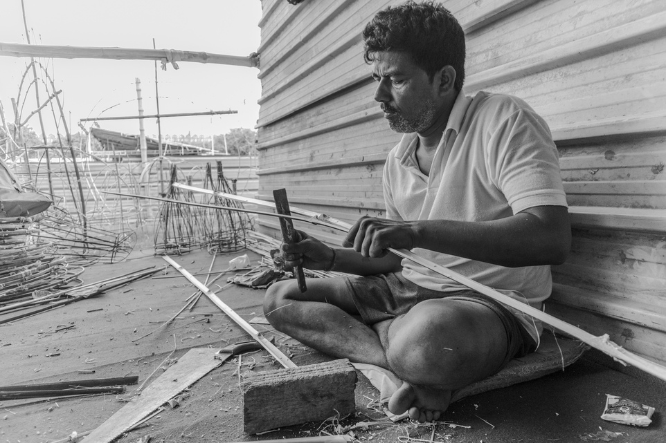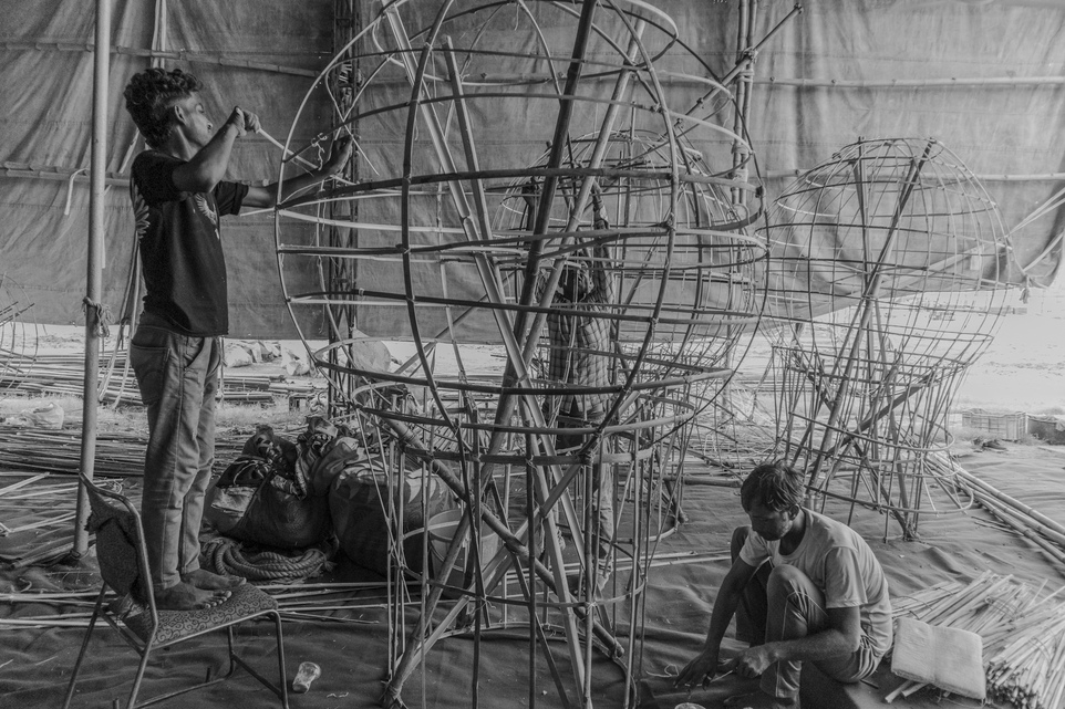 Devendra ties bamboo poles together with strong threads, weaving the foundation for the towering figures.