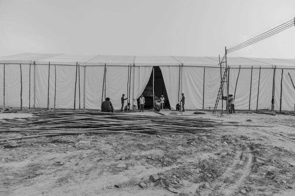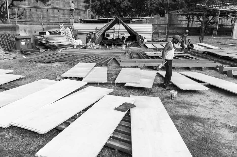 Workers making stage ready for the Ram Leela theatre