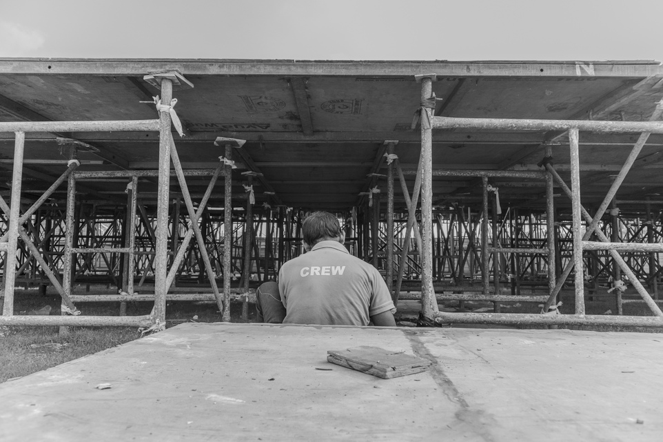 A dedicated crew member works meticulously on the stage where the Raamleela will soon unfold.