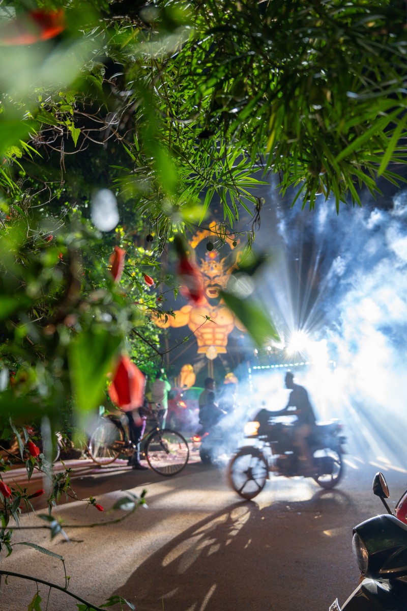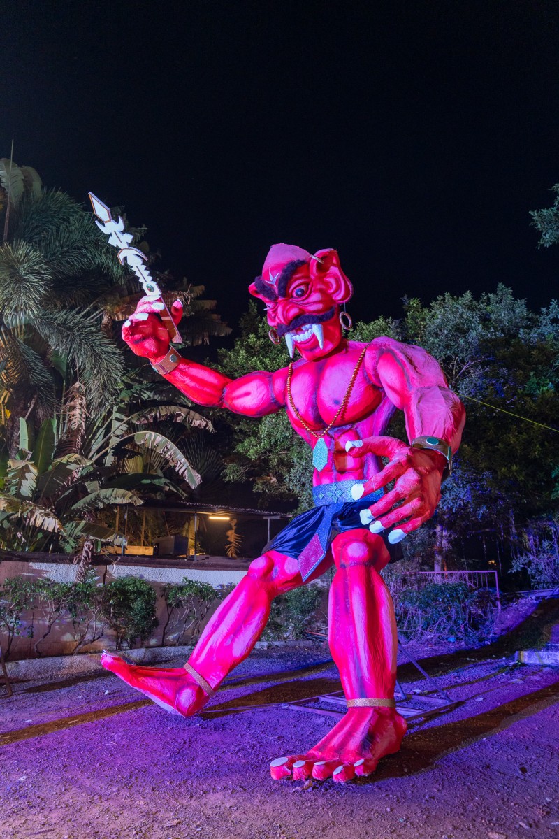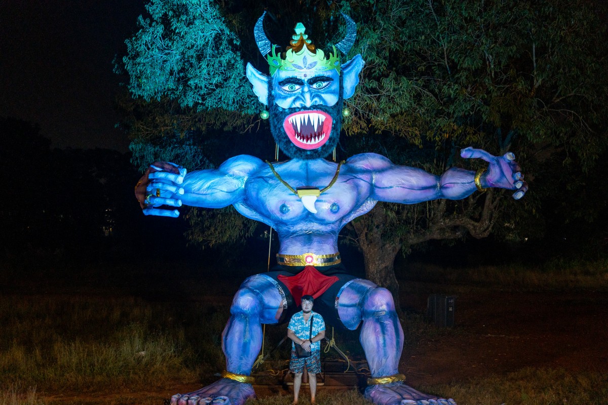 From one demon king with dreadlocks, to many more with sinewy muscular thighs to yet more with snake-like lower bodies – the interpretations are many. The effigies are decorated in a variety of ways, from golden chains, to whips made of neon light and even accomplices like the evil spirit from Hollywood's The Nun.