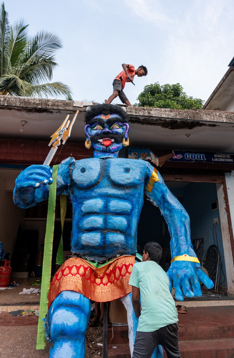 Two young boys work on a smaller-scale Narakasura in Agarwada, near the Chopdem junction in North Goa.