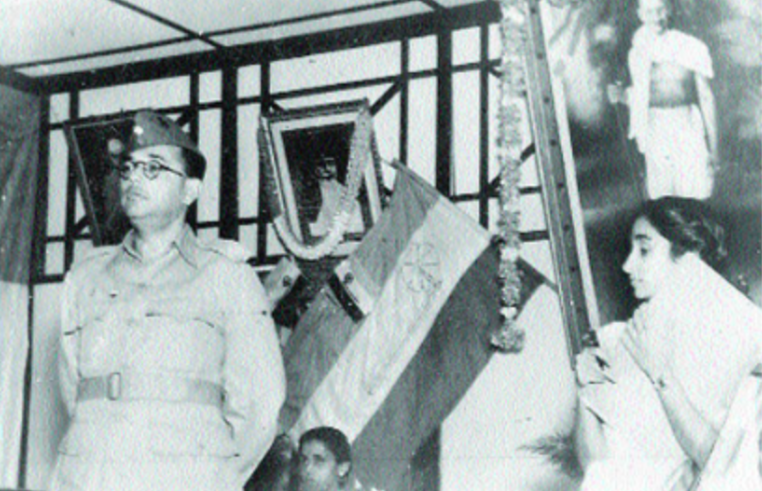 Netaji addresses a meeting at Singapore, 1943. Capt. Lakshmi Swaminathan is on the right. Note the national flag in the background – tricolour and charka. Source: Source: https://www.telegraphindia.com/north-east/lakshmi-sehgal-no-more/cid/402771