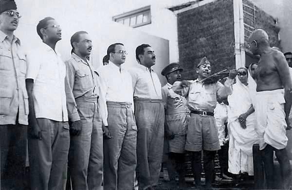 Delhi, 1945. Capt. Ram Singh Thakuri and other Azad Hind POWs sing the National Anthem during a visit by Gandhiji.