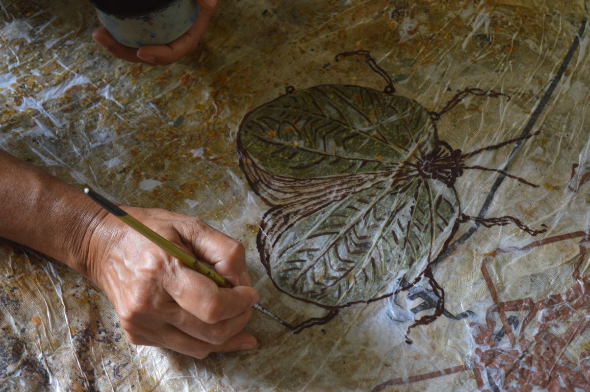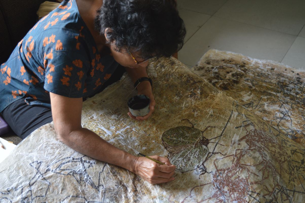 She chose Nepali paper and gauzy tissue paper because of its transparency. In her previous work, Chakravarty had created a turbulent river by folding tissue paper. In the current work, the folds of translucent cloth appear to be floating when the scrolls are backlit. As the glow of warm sunlight touches the reverse side of the scrolls, they come alive as if by magic and are transformed into giant pieces of amber with natural life trapped inside them. What takes one’s breath away is the amazing dexterity with which Chakravarty handles both the epic scale of the scrolls as well as the detailed and intricate drawings of the insects and the foliage that have the delicacy of miniature paintings.