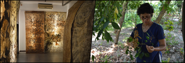 Chakravarty has mastered the art of making scrolls with multiple layers of paper and cloth embedded with the plants, weeds and roots that she has culled, treating each stratum with acrylic paint, mud washes, glitter and tea stains to produce an amazing array of textures, stains, striations and surfaces. She carefully arranges the plants on the prepared surface with the branches spread out as if they are in real life. Yards of tapes of audio cassettes become tangled roots. She constantly has to think of new ways of simulating reality, mostly using organic material.
